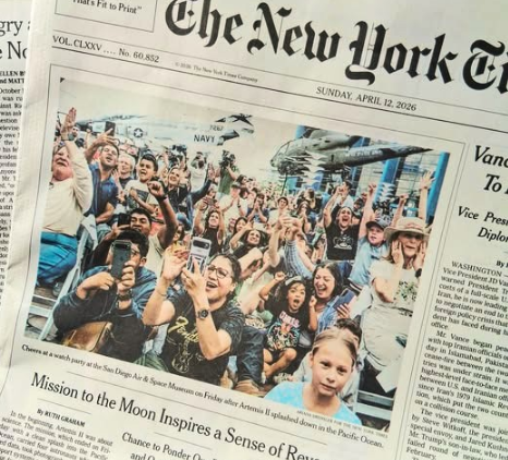 In the meantime, a cheerful celebration filled with happy tears was taking place at the San Diego Air & Space Museum in Balboa Park. As the rousing crowd viewed the events live from the museum, a photographer for the New York Times captured the energy. Two days later, the image graced Page One of the Times’ heavily circulated Sunday edition, with its caption citing the museum.